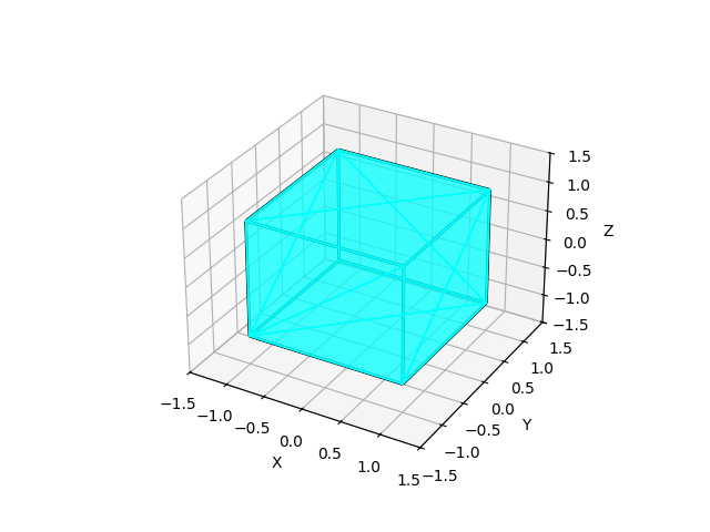 In the most abstract sense, the color of the triangles is a part of the cube's texture. It's a property assigned to each triangle, and these properties determine how the cube is displayed. Like last time, the viewpoint is the user, e.g., the person executing the code. The mesh is now a 3D cube with a texture contained within its triangles. The "rendered image" is the plot displayed by matplotlib. This ray tracer contains a type of "surrogate" physics: the color value assigned to the cube's triangles. This is still the most basic ray tracing possible: a mesh to visualize that contains textures, with these textures telling the code what and how to display the final image.