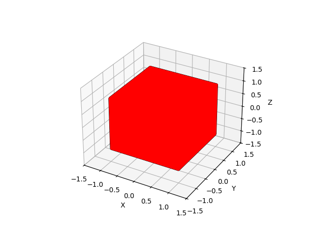 A textured cube mesh has been added to the git repo, https://github.com/pjdurst/ray-tracing-basics/tree/main/bare-bones-raytracing. This cube's texture is simply the color assigned to the triangles inside the mesh reading functions. To add these surface properties to the cube, we will adjust the variables that go into the Poly3DCollection structure that represents the faces of the cube. Below is our first "textured" object - the same cube, but now containing triangles that are the color red.